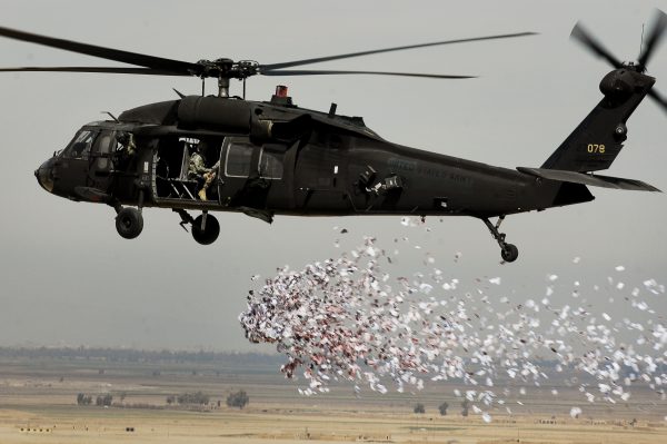 (Soldiers from the U.S. Army’s 350th Tactical Psychological Operations, 10th Mountain Division, drop leaflets over a village near Hawijah in Kirkuk province, Iraq, on March 6, 2008.)