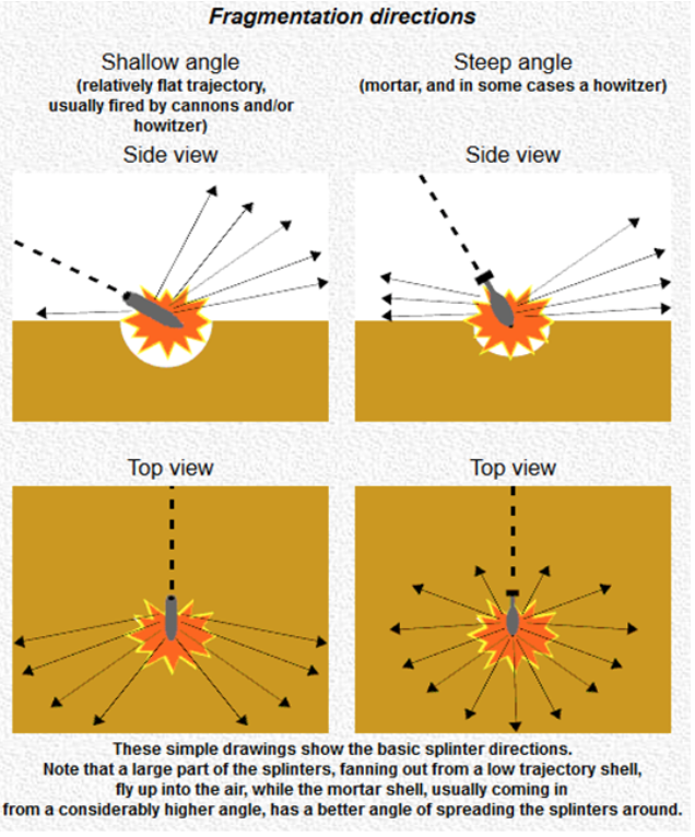The aperture of the craters formed and the amount of the splinters in them mostly depend on the shape and body of the shell, and also on the explosive filler inside. The directions of the splinters are affected by the velocity and the speed of rotation at the moment when the projectile explodes. Usually, the majority of the splinters are in the side cones (roughly 80 % of the splinters), and with the shells fired by cannons and howitzers, which have cylindrical projectiles, the aperture of the cone is usually between 40 – 50 degrees. The shells fired by mortars, are usually drop-shaped, giving the side cone an aperture of over 50 degrees. Below is the scheme of the dispersion of soil fragments.