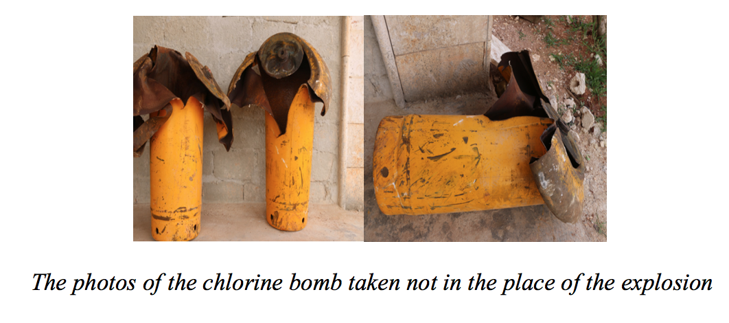 The density can be measured on the basis of the bomb’s form appeared in the video. The bomb of such type was allegedly dropped on Saraqeb. We identified that the chemical warheads for this barrel bomb do not exceed 10 kilos. Consequently, two barrel bombs’ mass is less than 20 kilos.