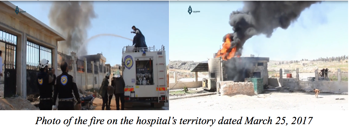 In the video of the Syrian opposition YouTube channel Qasioun News Agency on March 25, 2017, you can see White Helmets volunteers putting out one of the single-story buildings on the territory of the hospital.