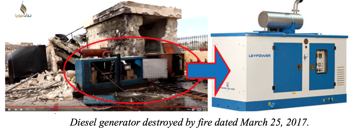 Near the building, we have found a burned diesel generator which previously supplied the hospital with electricity. The generator was destroyed by fire on March 25, 2017. The following video shows that the generator is out of order. Hence the hospital is out of operation since March 2017.