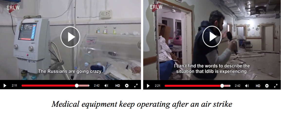 Besides, one shot demonstrating the so-called bombing aftermath shows no material damage, dust or any other effect from an alleged air strike. And then, in other shots (2 min 12 sec) with the very same hospital after an “air strike,” the doors are pulled off and the building is damaged.