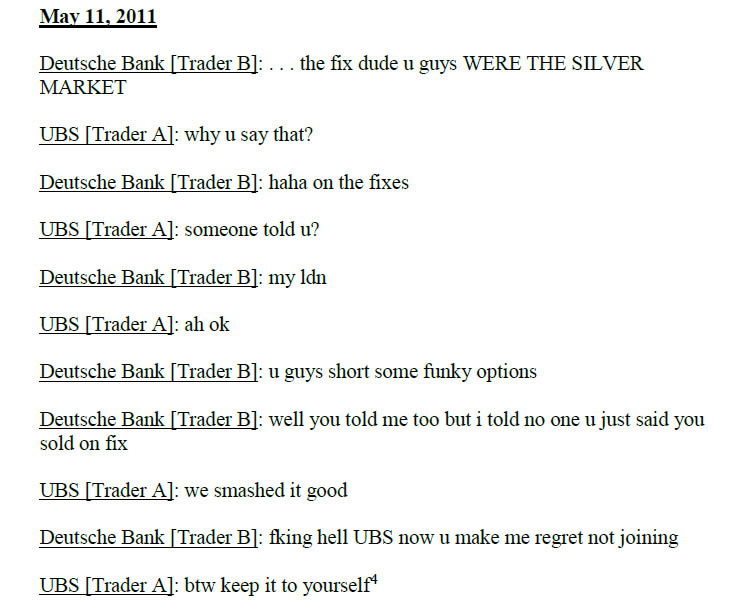 Another chat transcript from May 11, 2011 reveals a Deutsche Bank trader telling a UBS trader that the cartel “WERE THE SILVER MARKET”(sic) based on feedback from outside traders to which UBS replies, referring to the silver market “we smashed it good”, leading to the following lament “fking hell UBS now u make me regret not joining.”