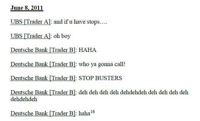 Finally, for all those traders who wonder what happened to their stops as a result of dramatic moves in the price, here is the answer: a June 2011 chat between a UBS and a DB trader comes down to the following: “if you have stops… who ya gonna call… STOP BUSTERS”