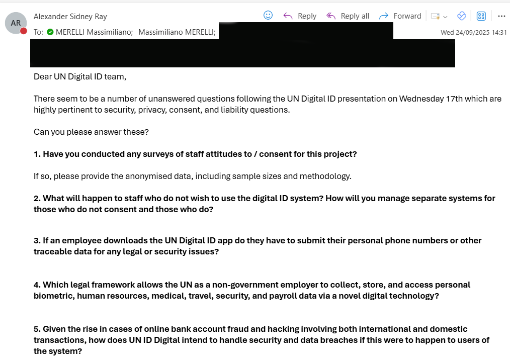 Ray noted that the UN’s 48th Session of the High-level Committee on Management in October 2024 explicitly states that “data control and liability concerns for staff when using their United Nations Digital ID were stressed,” but there has been no further information provided to UN staff regarding these concerns.