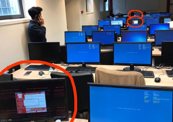 In Italy, one user shared images appearing to show a university computer lab with machines locked by the same program.