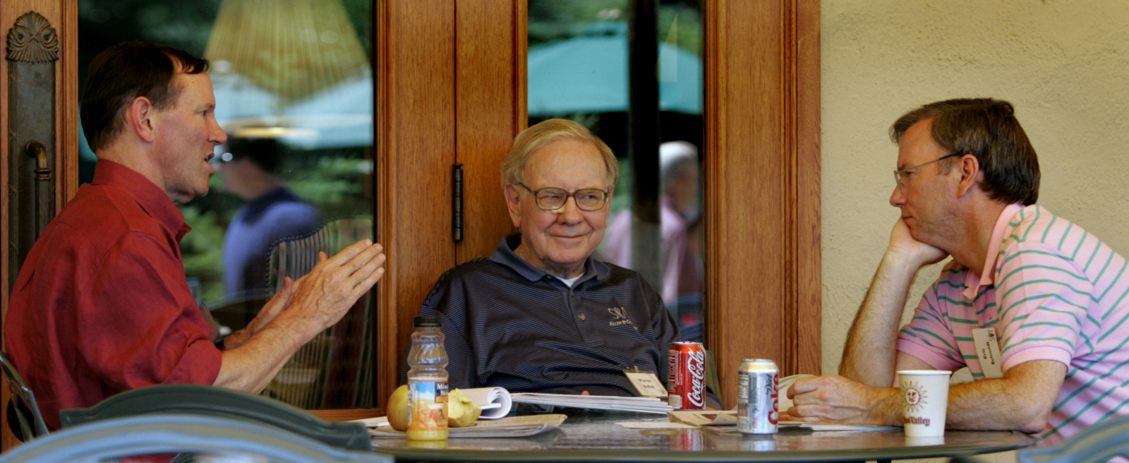 The Washington Post’s Don Graham, Billionaire Warren Buffett and Google’s Eric Schmidt chat at the annual Allen and Co.’s conference, July 7, 2005. (AP/Douglas C. Pizac)