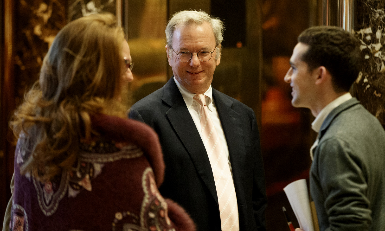 Eric Schmidt, executive chairman of Alphabet, Inc., stands in the lobby of Trump Tower in New York, Jan. 12, 2017. (AP/Evan Vucci)