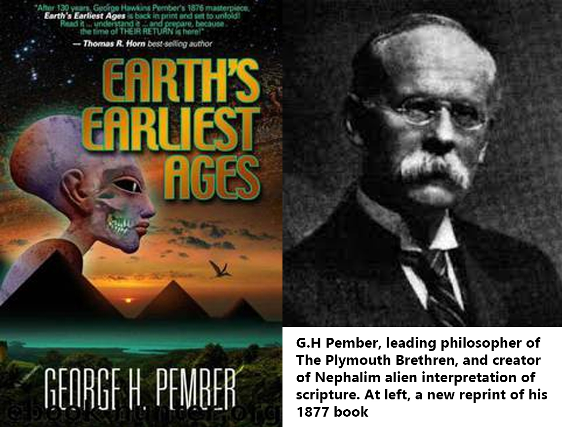 Darby’s influence can also be seen in the works of Charles Fox Parham (the founder of Pentecostalism), George Pember, (the originator of the ‘fallen Nephilim’ interpretation of demonology now advanced by the alien disclosure movement), Dwight Lyman Moody (founder Moody Bible College), and James Hall Brookes (founding father and president of the Niagara Bible Conference, which helped spread Dispensationalism across America).