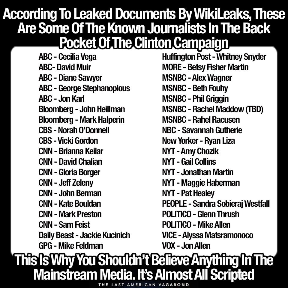 With this in mind, The Last American Vagabond reviewed the recently leaked emails by WikiLeaks and compiled a list of each journalist that has been outed as a Clinton stooge, so that the American people can have a clearer picture of the depths to which this country’s media has fallen. It should also be noted that this is not just limited to Clinton, as Trump no doubt has many journalists in his pocket as well. Trump wishes to be seen as this “anti-establishment” candidate, but that could not be further from the truth; Trump is the literal embodiment of the establishment and could not be further removed from the average American. However, as Julian Assange has made it his mission to highlight the absolute criminal activity of the Clinton’s, this compilation will focus on those journalists clearly in the pocket of the Clinton campaign:
