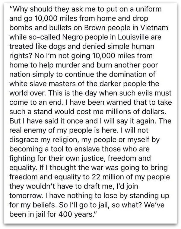 “My conscience won’t let me go shoot my brother, or some darker people, or some poor hungry people in the mud for big powerful America,” he famously said. “And shoot them for what? They never called me nigger, they never lynched me, they didn’t put no dogs on me, they didn’t rob me of my nationality, rape and kill my mother and father. … Shoot them for what? How can I shoot them poor people? Just take me to jail.”