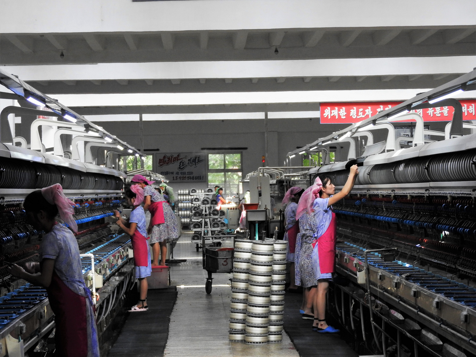 Under colonial Japanese rule, Pyongyang Silk Factory laborers worked in unsanitary conditions. When Korea gained independence, conditions were gradually modernized and improved. The present-day factory is clean and well lit, with water coolers throughout. The 1,600 workers work eight-hour shifts, with financial incentives to those who exceed their quotas. A nursery provides childcare, and unmarried women have accommodation on site, with a cafeteria and sports and leisure areas.