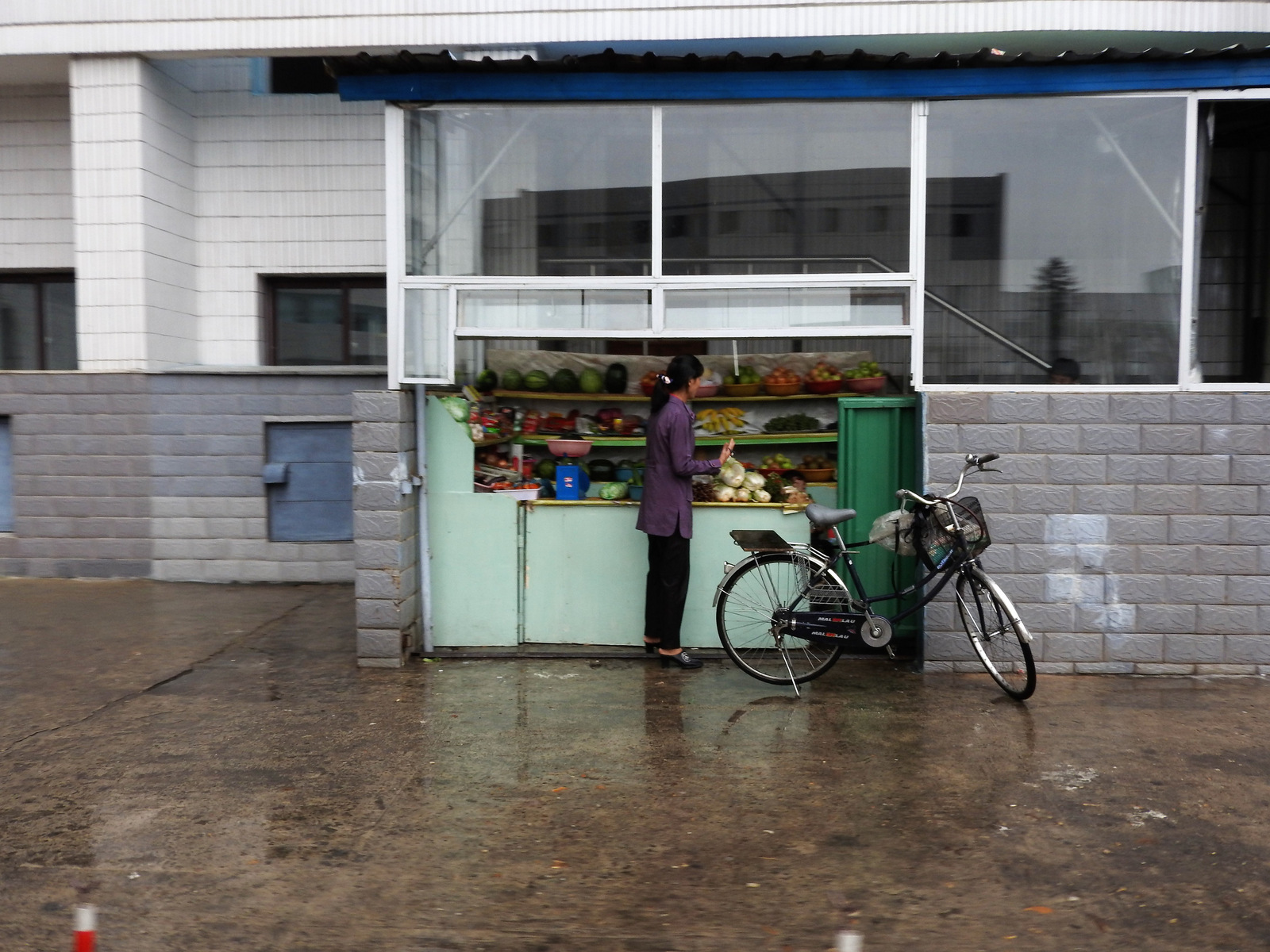 Fruit stand seen in Pyongyang. Small stands this size also sell snack food, sweets, water, sodas, beer, and ice cream.