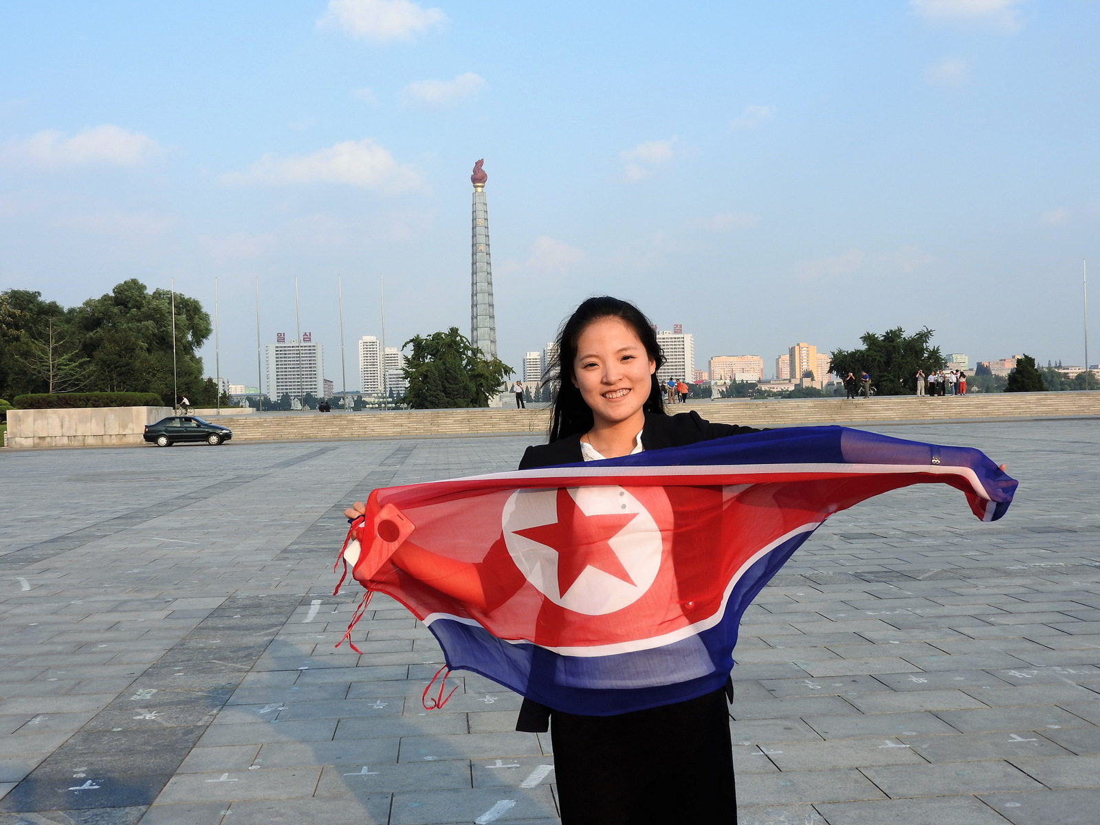 One of our hosts, Kim-Young, holding the flag of the DPRK. Behind her, the Juche tower, so-named after the dominant philosophy of self-reliance. Our other host, Kim Song-Nam, explained: “The Juche philosophy was created by President Kim Il-Sung. Man decides his own destiny, we rely on our own resources.”