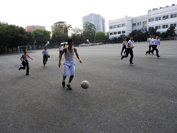 The Pyongyang International Football School opened in 2013. The complex includes a massive stadium and a school teaching all subjects, with football as a focus for the roughly 200 students. Different classes practiced their skills outside, doing warm-up drills to energetic music. When years ago I lived in Korea’s south, practicing Tae Kwan Do I warmed-up to similar drills.