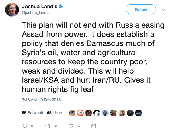 This would fit in perfectly with comments Professor Joshua Landis made about the attack, saying that America’s plan is to keep Syria weak, poor and divided in order to disadvantage US/Israel/Saudi rivals Iran and Russia. It would also clarify US Secretary of State Rex Tillerson’s assertion a few weeks ago that thousands of American troops are being kept in Syria to prevent Assad from regaining control of areas that have been liberated from ISIS.