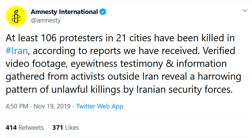 Amnesty International @amnesty – 15:50 UTC · Nov 19, 2019 At least 106 protesters in 21 cities have been killed in #Iran, according to reports we have received. Verified video footage, eyewitness testimony & information gathered from activists outside Iran reveal a harrowing pattern of unlawful killings by Iranian security forces.