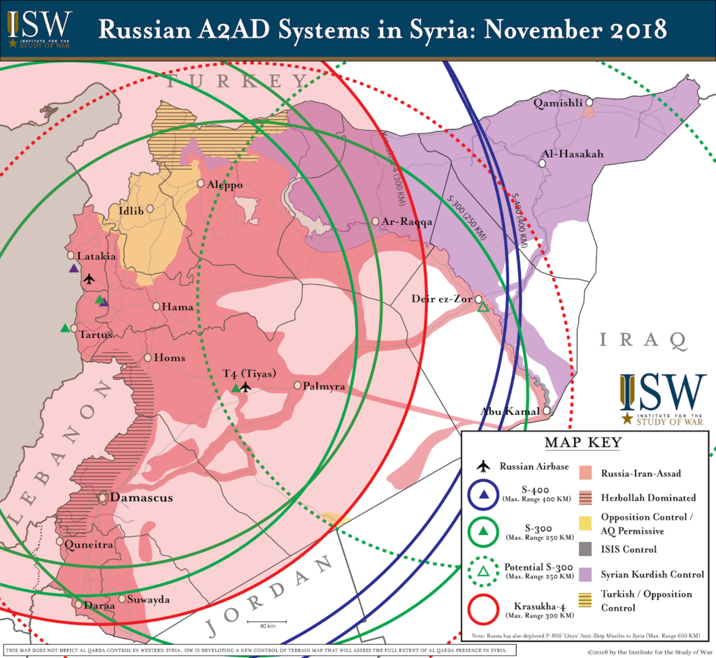 Russia ultimately aims to use its technical capabilities as part of its wider campaign to force the withdrawal of the U.S. Anti-ISIS Coalition from Syria. Russia can use these systems to decrease the overall freedom of maneuver – and increase the overall risk – faced by the U.S. in Syria. Russia’s combined air defense and electronic warfare networks will increase the cost of aerial and naval operations by the U.S. in Syria and the Eastern Mediterranean. It raises the cost of future airstrikes to deter chemical weapons attacks by Syrian President Bashar al-Assad. It also increases the cost of future strikes by Israel against Iran in Syria. The U.S. and Israel both must be prepared to suppress a larger number of air defense systems and use more expensive stealth aircraft such as the F-35 in Syria.[42] Russia stands to gain a long-term strategic advantage over NATO through its new capabilities in Syria. The U.S. and NATO must now account for the risk of a dangerous escalation in the Middle East amidst any confrontation with Russia in Eastern Europe.