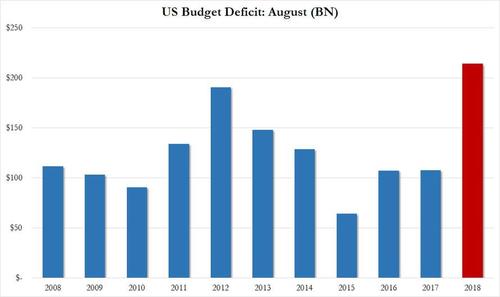 The August deficit brought the cumulative 2018F budget deficit to over $898BN during the first 11 month of the fiscal year, up a whopping 40% over the past year.