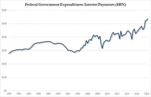 But while out of control government spending is clearly a concern, an even bigger problem is what happens to not only the US debt, which recently hit $21.3 trillion, but to the interest on that debt, in a time of rising interest rates.