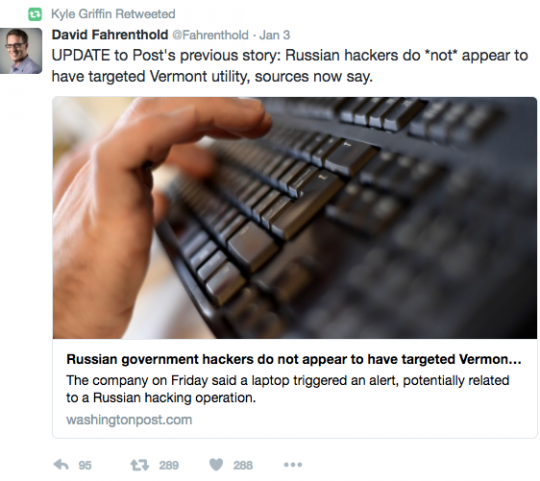 Even more instructive is the case of MSNBC’s Kyle Griffin, a prolific and skilled social media user who has seen his following explode this year with a constant stream of anti-Trump content. On Friday night, when the Post story was published, Griffin hyped it with a series of tweets designed to make the story seem as menacing and consequential as possible. That included hysterical statements from Vermont officials — who believed the Post’s false claim — that in retrospect are unbelievably embarrassing.