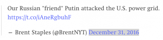 The second story on the electric grid turned out to be far worse than I realized when I wrote about it on Saturday, when it became clear that there was no “penetration of the U.S. electricity grid” as the Post had claimed. In addition to the editor’s note, the Russia-hacked-our-electric-grid story now has a full-scale retraction in the form of a separate article admitting that “the incident is not linked to any Russian government effort to target or hack the utility” and there may not even have been malware at all on this laptop.