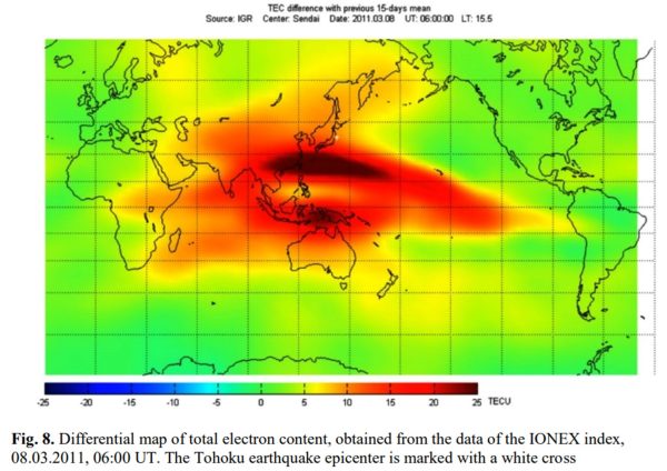 In the relatively recent case of the deadly magnitude 9.1 earthquake that struck Japan, it resulted in the tsunami that smashed into the Japanese coast in March 2011 killing over 20,000 and leaving $38 billion in damage in its wake. As can be seen in the graphic below, this tragedy would have been entirely forecastable had anyone looked at the spike in electron density in the ionosphere above the epicenter which began eleven days prior to the disaster as demonstrated during a forensic analysis by Chinese researcher Fuying Zhu at the Wuhan Institute of Seismology in August 2011.